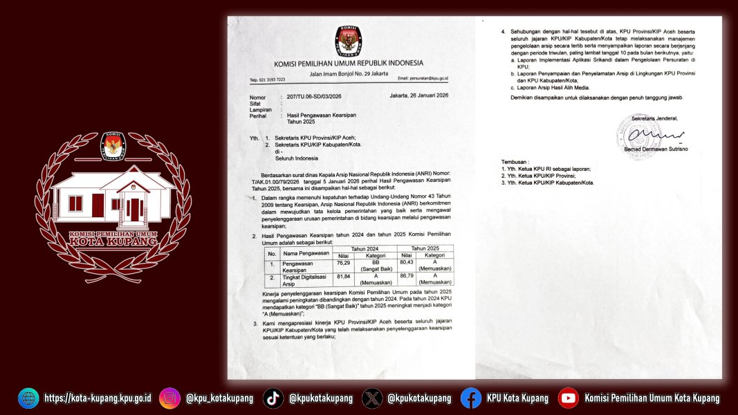 #Teman Pemilih, Kinerja Komisi Pemilihan Umum mendapatkan predikat “MEMUASKAN” terkait Tingkat Digitaslisai Arsip berdasarkan pengawasan dan evaluasi Badan Arsip Nasional Republik Indonesia (ANRI), Kupang (27/1). Secara Nasional, Komisi Pemilihan Umum merupakan Lembaga penyelenggara Pemilihan Umum sehingga kearsipan merupakan elemen penting yang merekam jejak pelaksanaan Pemilu dan Pemilihan secara khusus dari segi administratif. Kondisi ini memberikan gambaran bahwa administasi tidak hanya terpaku pada system pertanggungjawaban semata, akan tetapi merupakan salah satu aspek akuntabilitas dari Lembaga terkait, terhadap pelaksanaan program dan kegiatan kelembagaan dalam proses pelayanan publik, sehingga dapat meningkatkan kepercaayaan publik atau Masyarakat. Berdasarkan hasil pengawasan yang dikeluarkan oleh Badan Arsip Nasional Republik Indonesia terkait pengawasan Kearsipan di liungkungan Komisi Pemilihan Umum ada beberapa aspek yang dinilai yaitu “Pengawasan Kearsipan” dengan Nilai 80,43 di Kategori (A/Memuaskan) dan “Tingkat Digitalisasi Arsip” dengan Nilai 86,79 di Kategori (A/Memuaskan). Predikat penilaian yang diterima merupakan Gambaran Kepatuhan Lembaga terhadap Regulasi yang berlaku serta motivasi untuk terus meningkatkan akuntabiltas pelaksanaan program dan kegiatan yang terekam secara tertip dalam system kearsipan kelembagaan khususnya dalam pelaksanan Pemilu dan Pemilihan. Sekretaris Jenderal Komisi Pemilihan Umum Republik Indonesia melalui Surat Nomor: 207/TU.06-SD/03/2026 Perihal Hasil Pengawasan Kearsipan Tahun 2025, Tanggal 26 Januari 2026. Memberikan apresiasi kepada KPU Provinsi dan KPU Kabupaten/Kota atas kerjasama yang baik sehingga pengelolaan kearsip mendapatkan hasil yang sangat memuaskan. ....