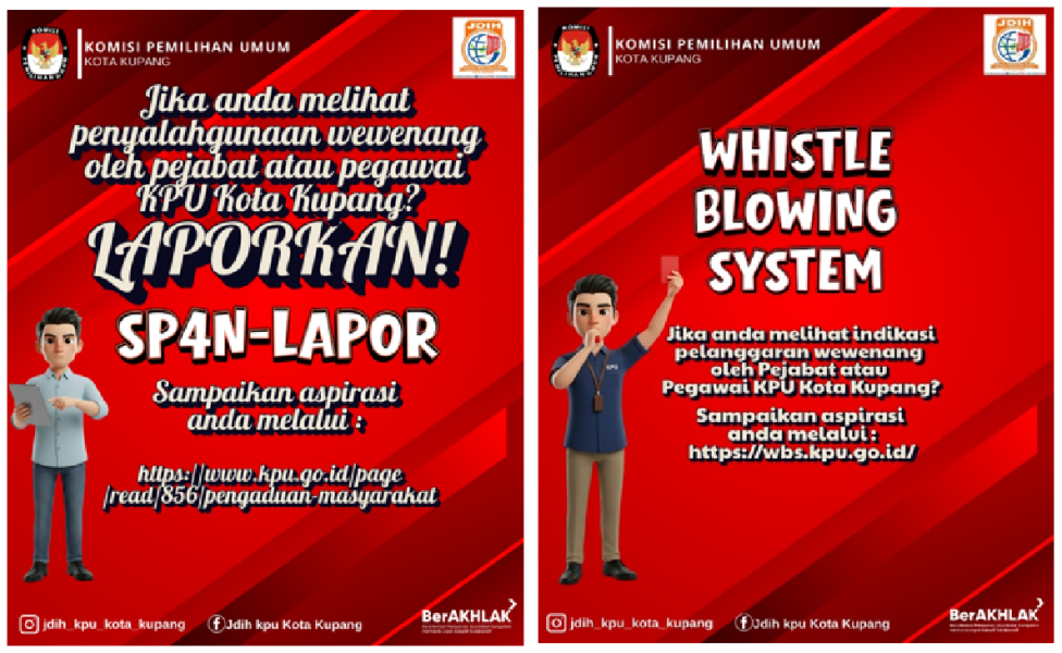 #Teman Pemilih, masukan dan tanggapan masyarabkat merupakan barometer yang dapat dipakai untuk mengukur peningkatan kualitas dan kinerja pelayanan yang dilaksanakan oleh Komisi Pemilihan Umum Kota Kupang. Hal tersebut dapat menunjang akuntabilitas dan transparansi lembaga, dengan demikian Komisi Pemilihan Umum Kota Kupang menjadi lembaga yang bermartabat dalam menyelenggrakan pelayanan dan akses infromasi publik kepada Masyarakat di Kota Kupang. Berikut link yang kami sediakan sebagai berikut : SP4N-LAPOR : https://www.kpu.go.id/page/read/856/pengaduan-masyarakat Whistle Blowing System (WBS) : https://wbs.kpu.go.id/ ....