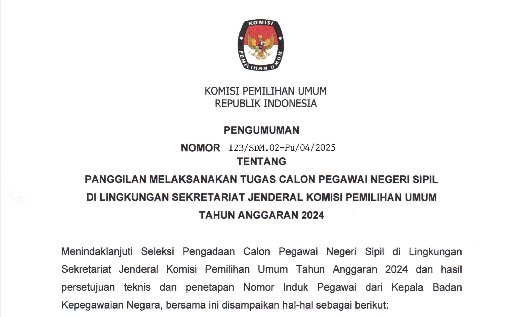 Panggilan Melaksana Tugas kepada Calon Pengawai Negeri Sipil di Lingkungan Sekretariat Jenderal Komisi Pemilihan Umum Republik Indonesia. Informasi berdasarkan pengumuman bahwa Calon Pegawai Negri Sipil yang bersangkutan untuk melapor diri pada Hari Senin Tanggal 02 Juni 2025 pada Unit/Satuan Kerja Penempatan. Demikian informasi ini disampaikan untuk ditindaklanjuti. Atas perhatian dan kerja sama nya, kami ucapkan terimakasih dan selamat melaksanakan tugas.