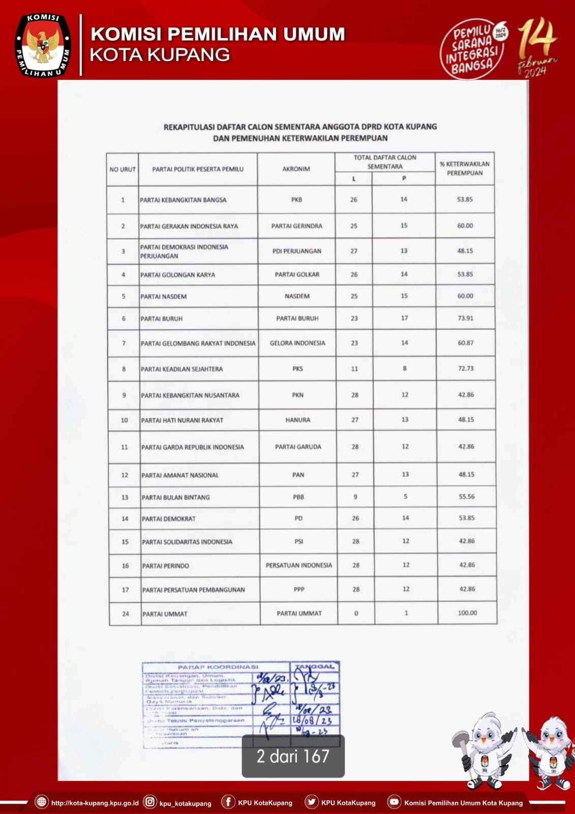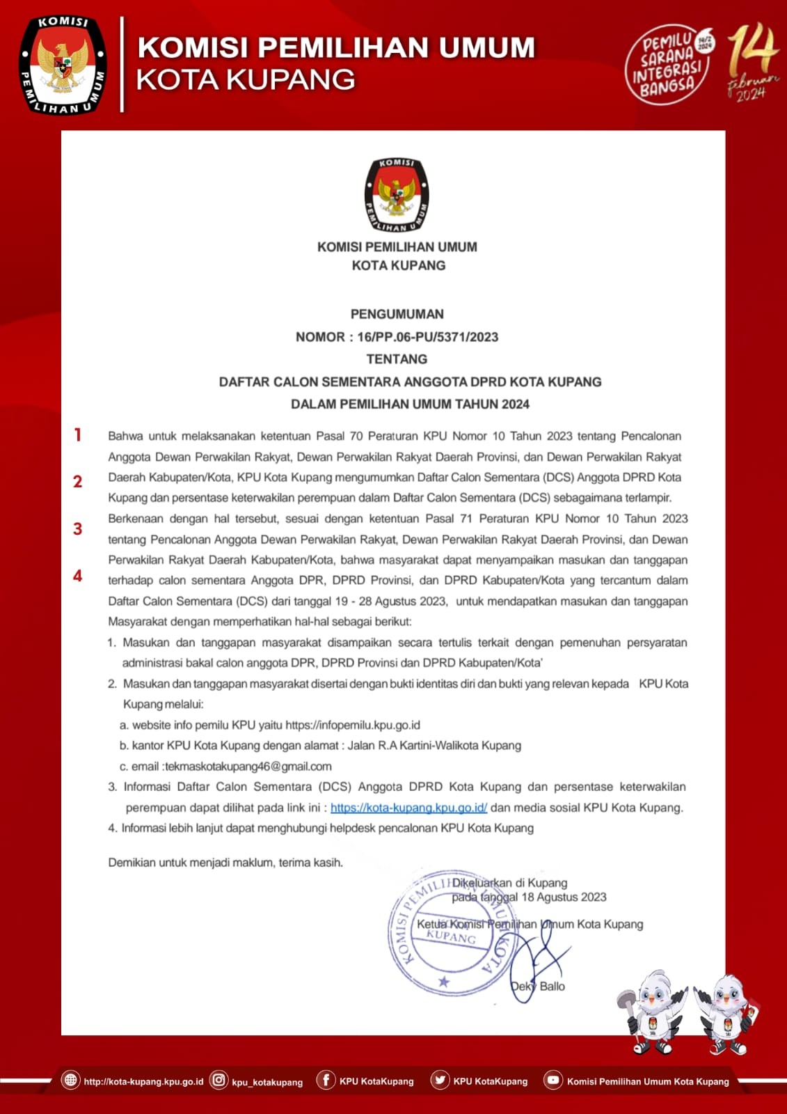 Pengumuman Nomor :16/PP.06-PU/5371/2023 Tentang Daftar Calon Sementara Anggota DPRD Kota Kupang Dalam Pemilihan Umum Tahun 2024.